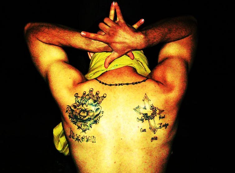Dos tatoué d’un ‘Latin King’, membre d’un gang ennemi des Ñetas, gang politique né dans les prisons américaines. Wikimedia/ Javier Ramirez, CC BY-NC-ND